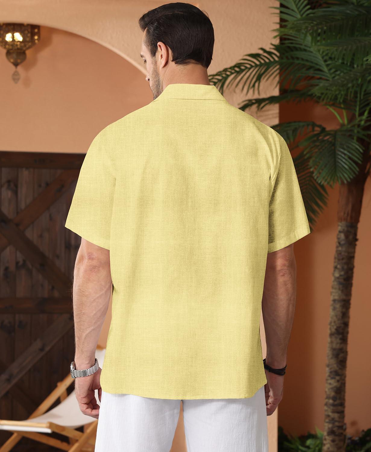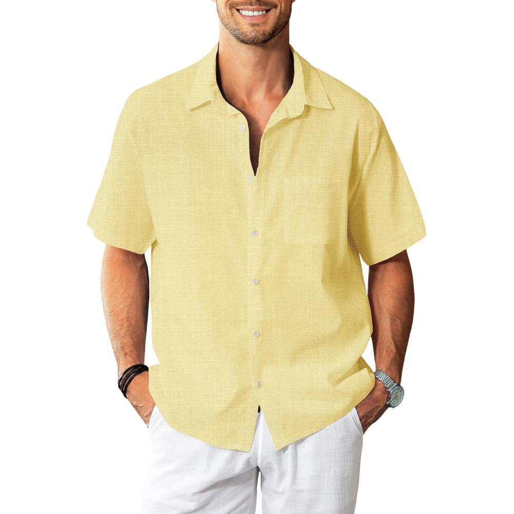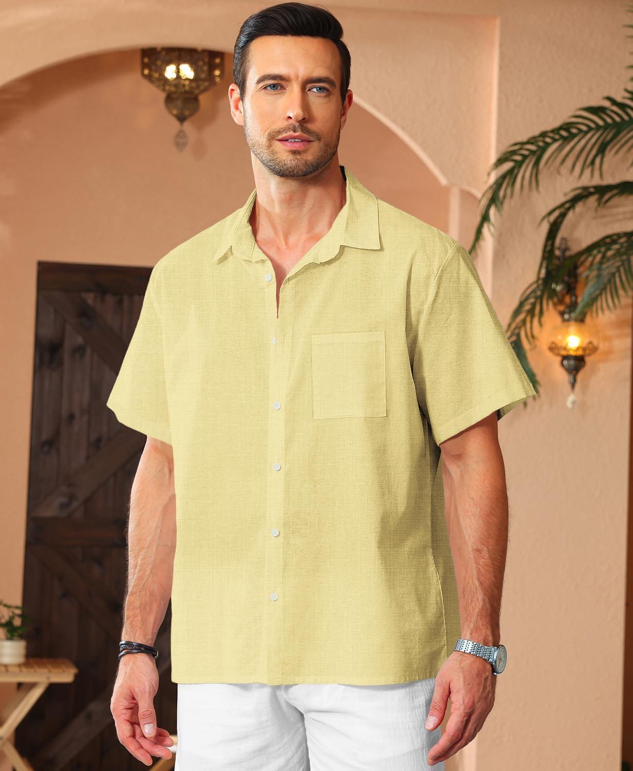 KYKU Linen Shirts for Men: Casual Cotton Mens Short Sleeve Button Down Shirts Beach Wedding Summer Clothes with Pocket(Yellow Cotton Linen Mens Shirts)