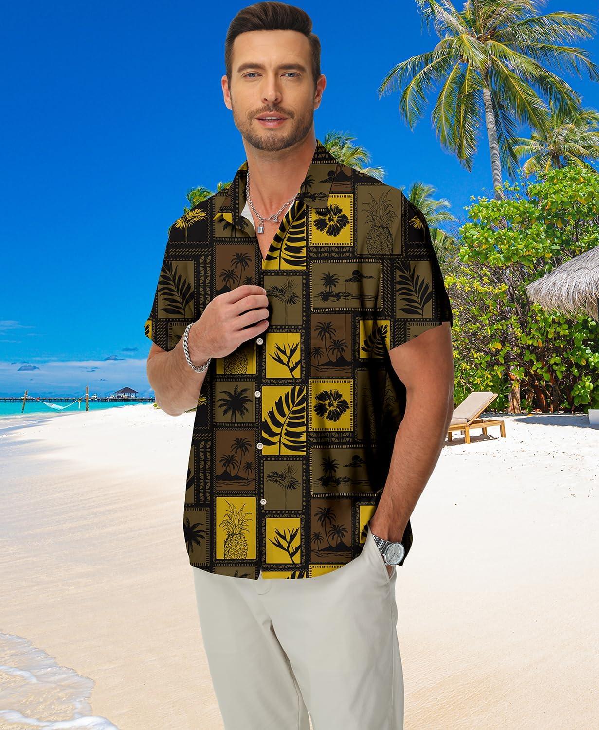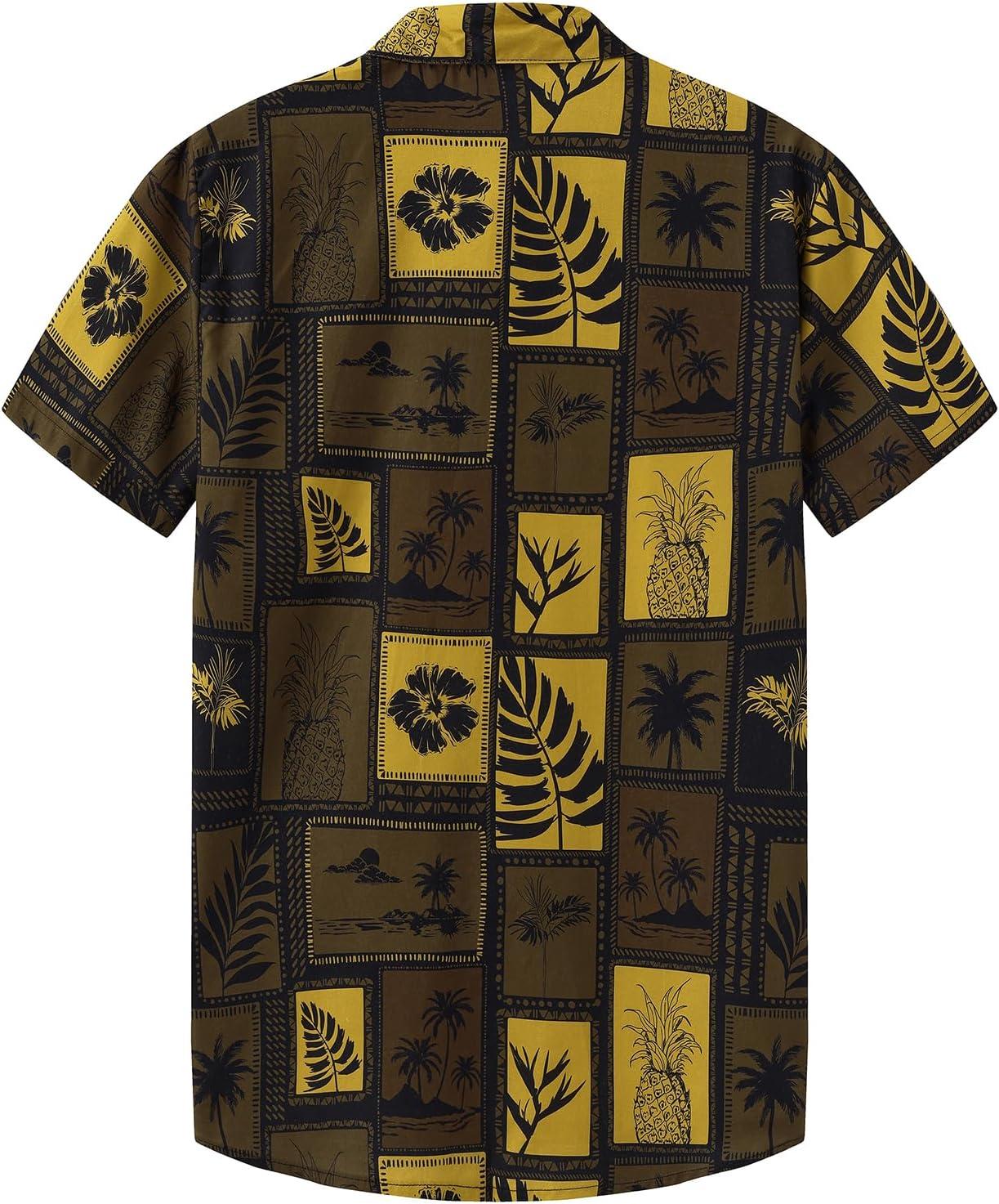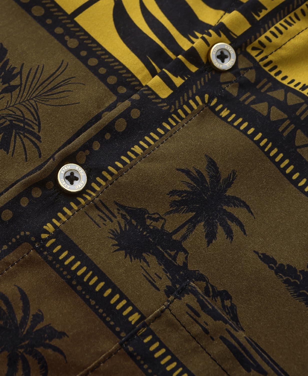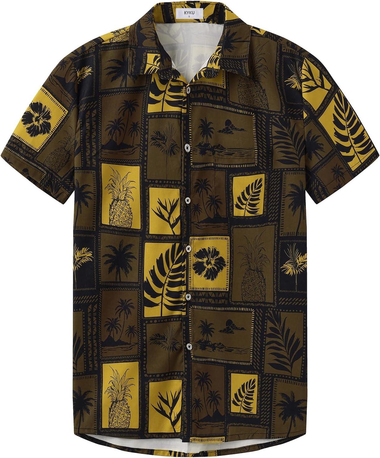 KYKU Men’s Hawaiian Shirt Short Sleeve Button Down Casual Tropical Summer Beach Vacation Shirts with Pocket(Brown Hawaiian Men Button Down Shirt)