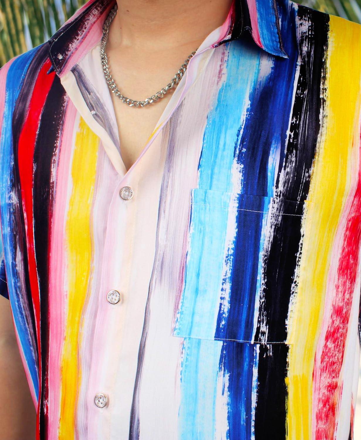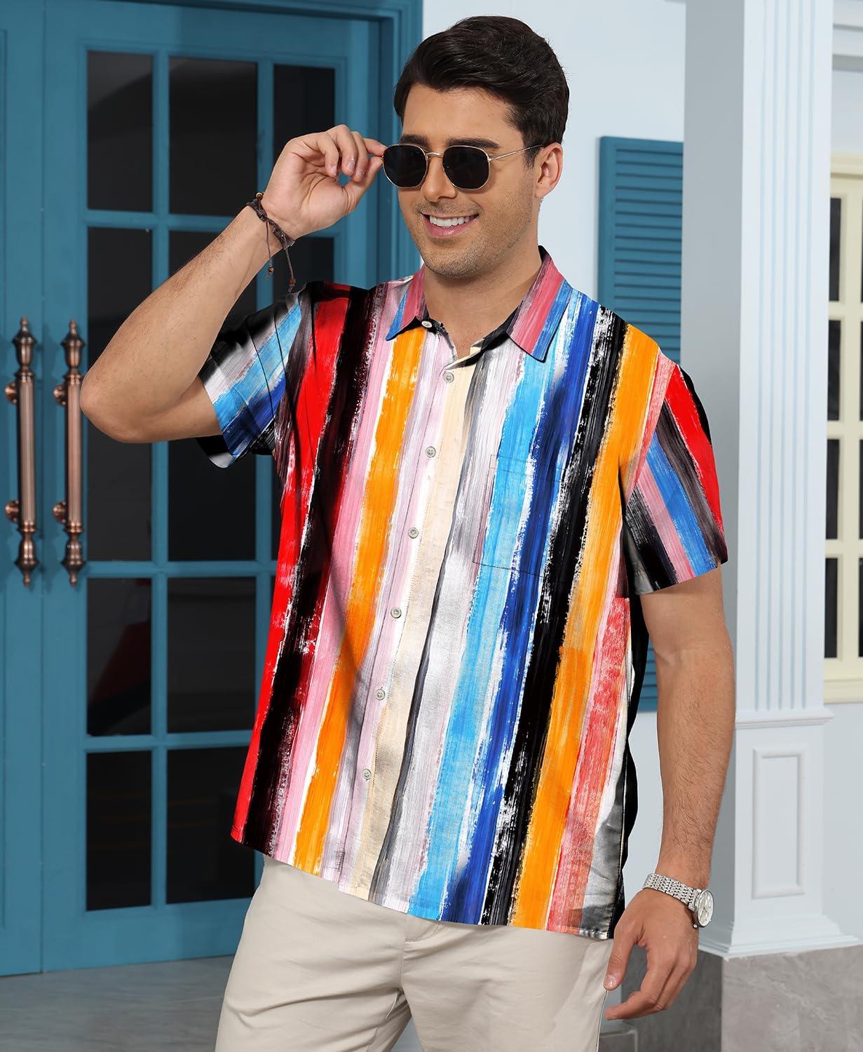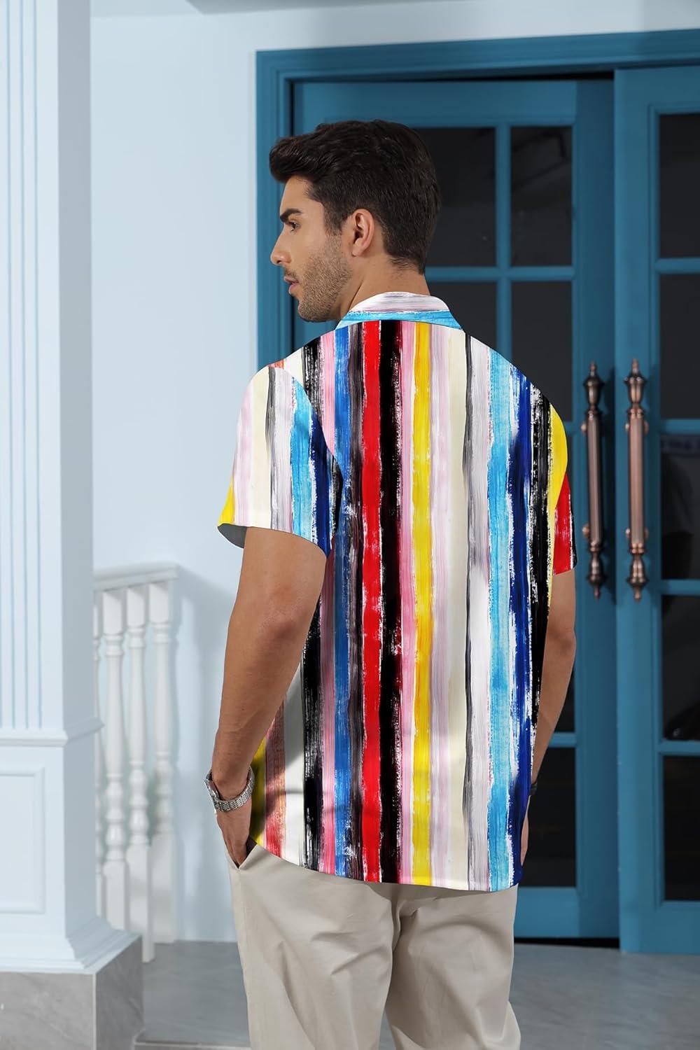 KYKU Men’s Hawaiian Shirt Short Sleeve Button Down Casual Tropical Summer Beach Vacation Shirts with Pocket(Multicolor Striped Hawaiian Shirt for Men)
