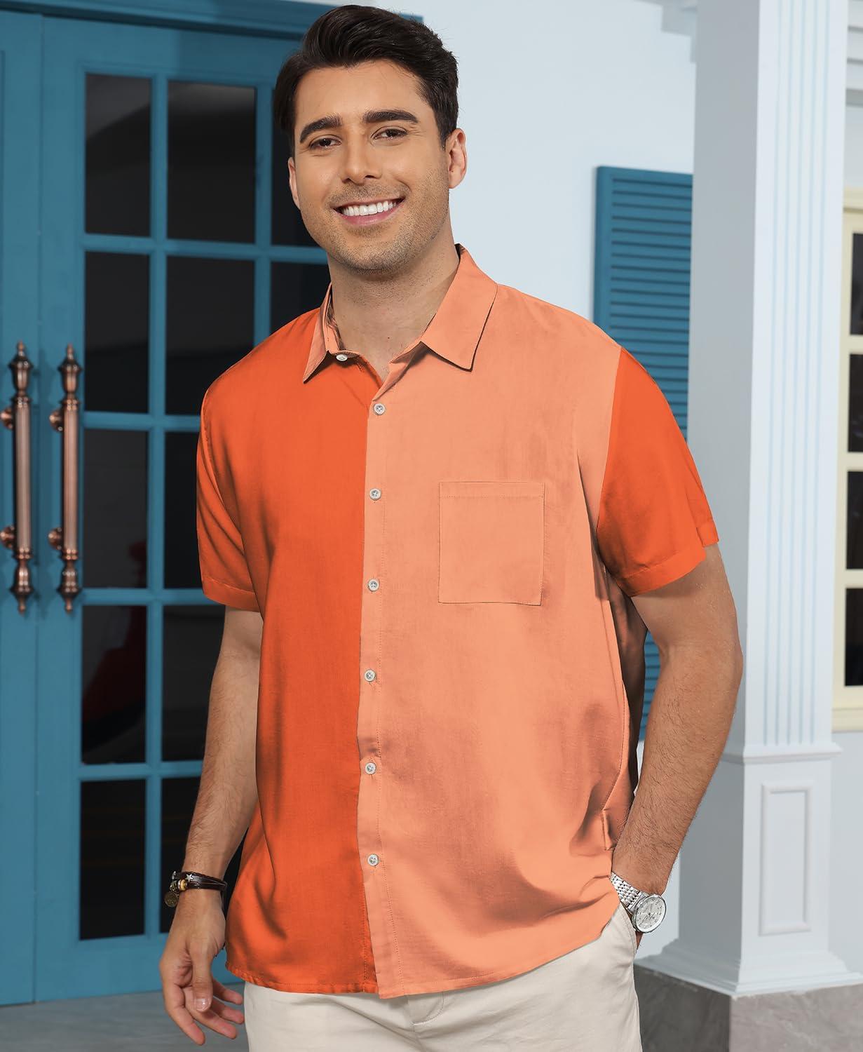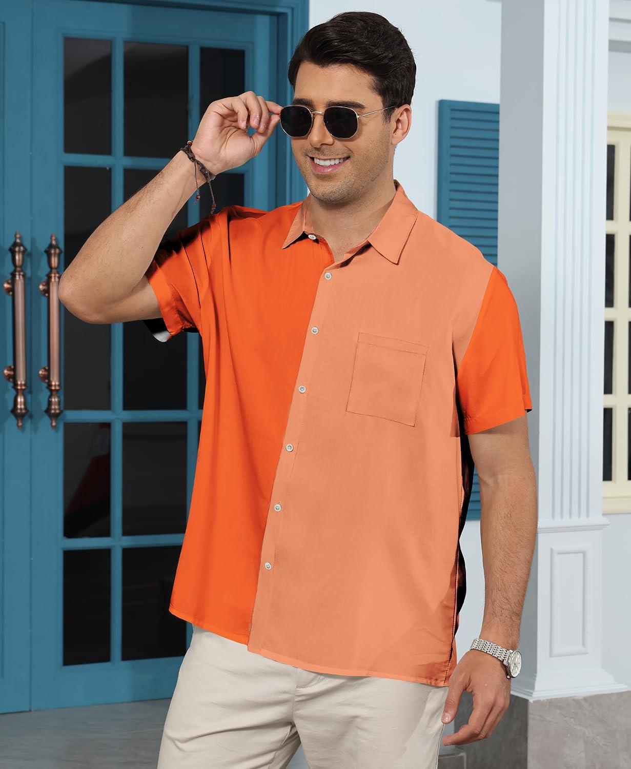 KYKU Men’s Hawaiian Shirt Short Sleeve Button Down Casual Tropical Summer Beach Vacation Shirts with Pocket(Orange Color Block Summer Shirt for Men)