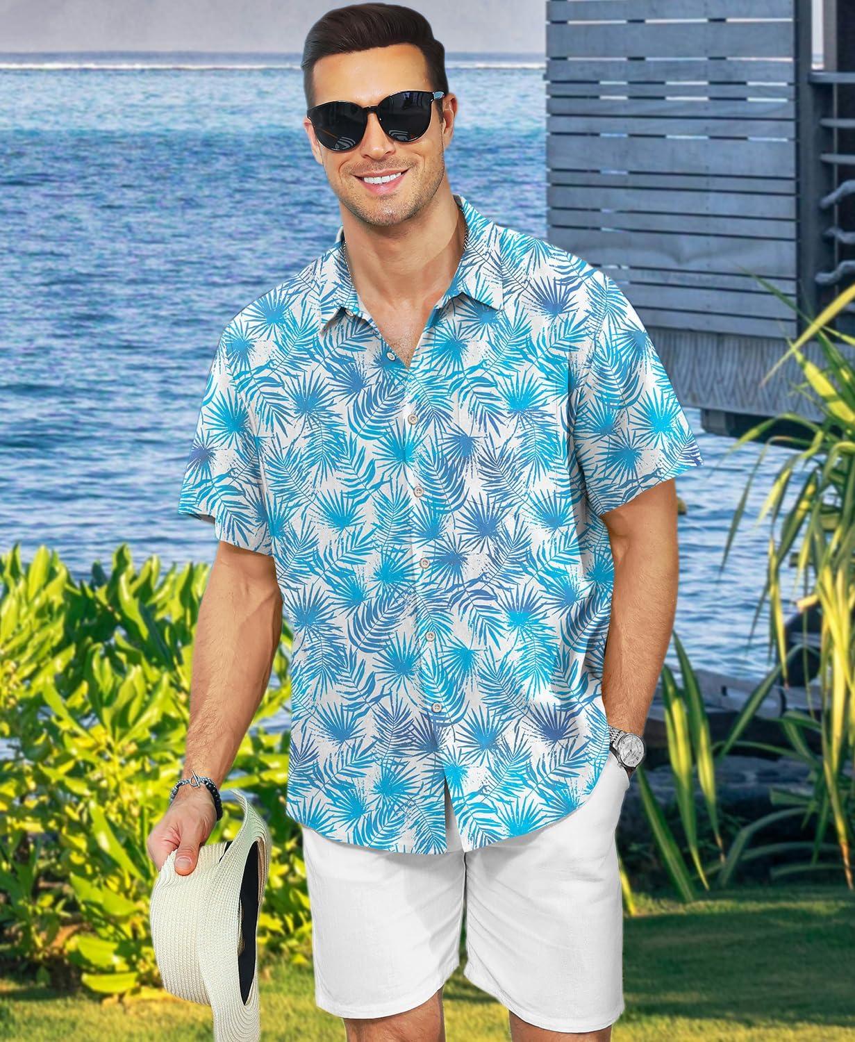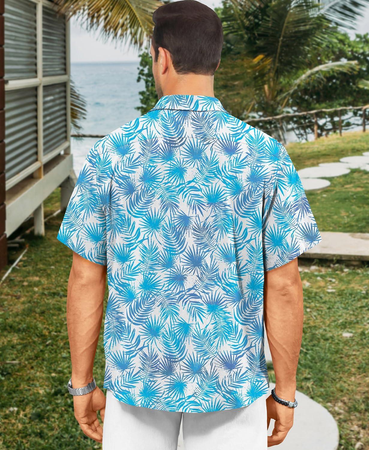 KYKU Men’s Hawaiian Shirt Short Sleeve – Tropical Summer Beach Button Down Shirt with Pocket(Blue Tropical Leaf White Mens Hawaiian Shirt)