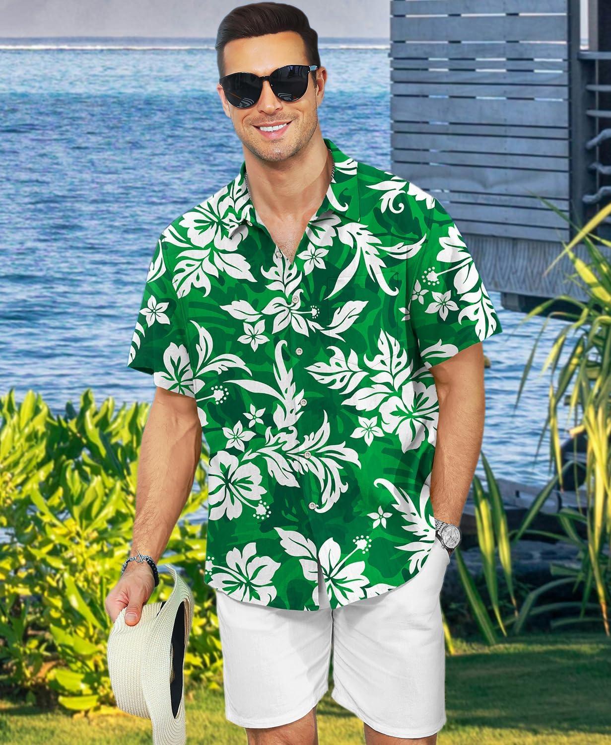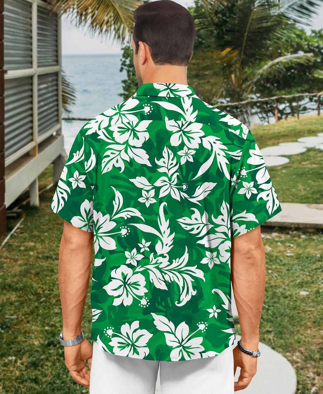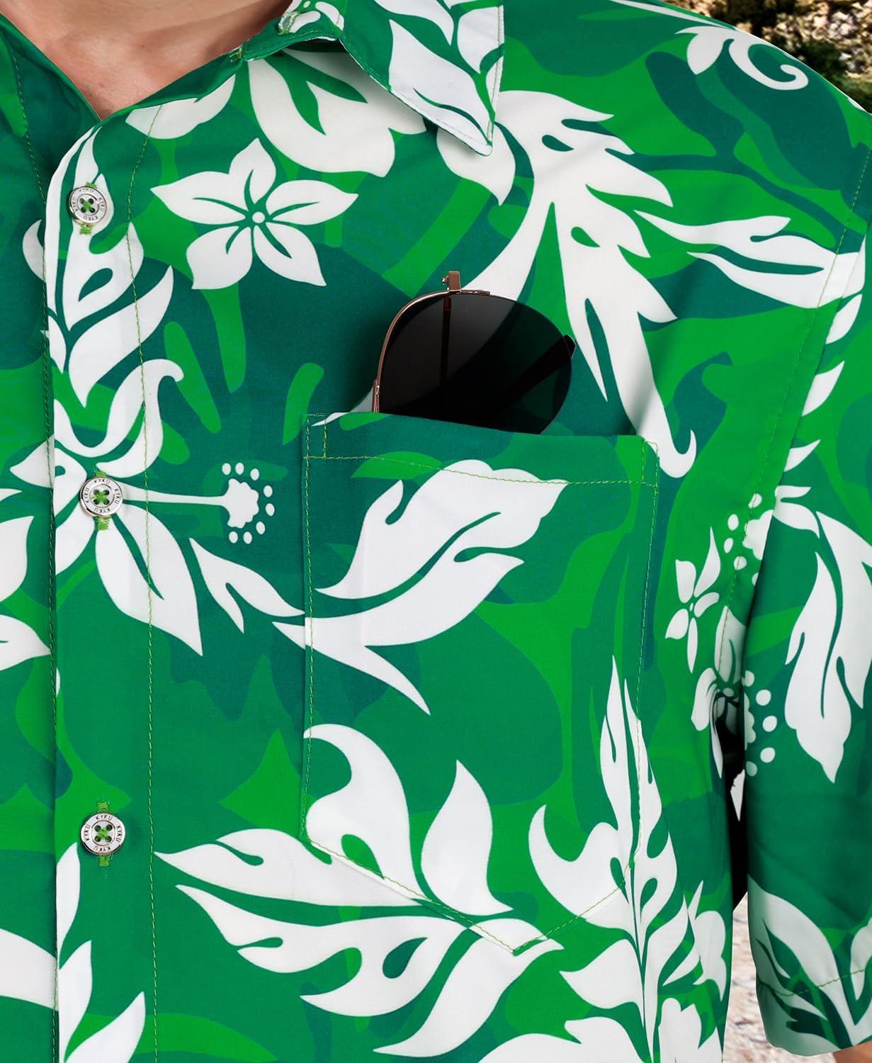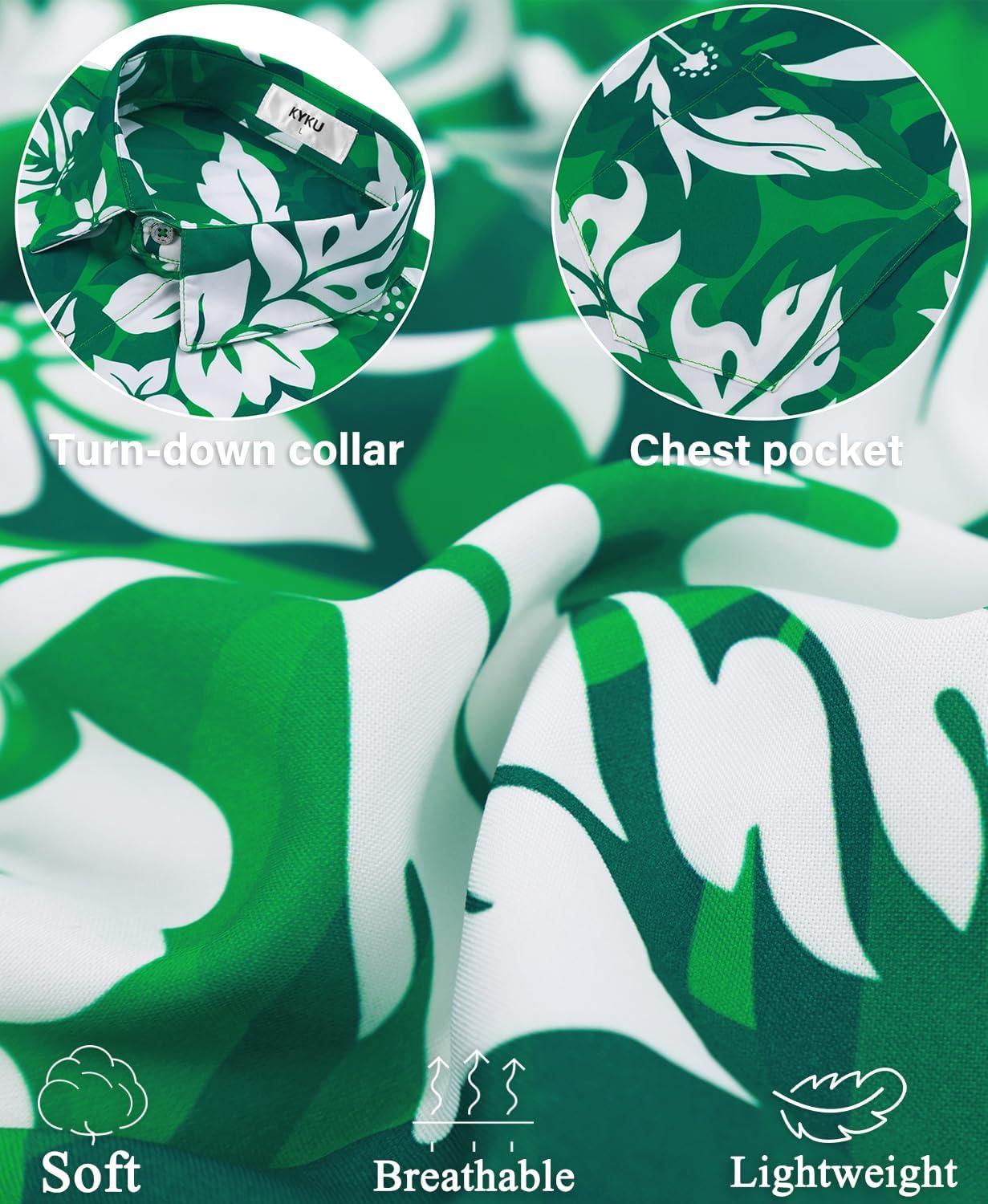 KYKU Men’s Hawaiian Shirt Short Sleeve – Tropical Summer Beach Button Down Shirt with Pocket(Green White Floral Mens Hawaiian Shirt)