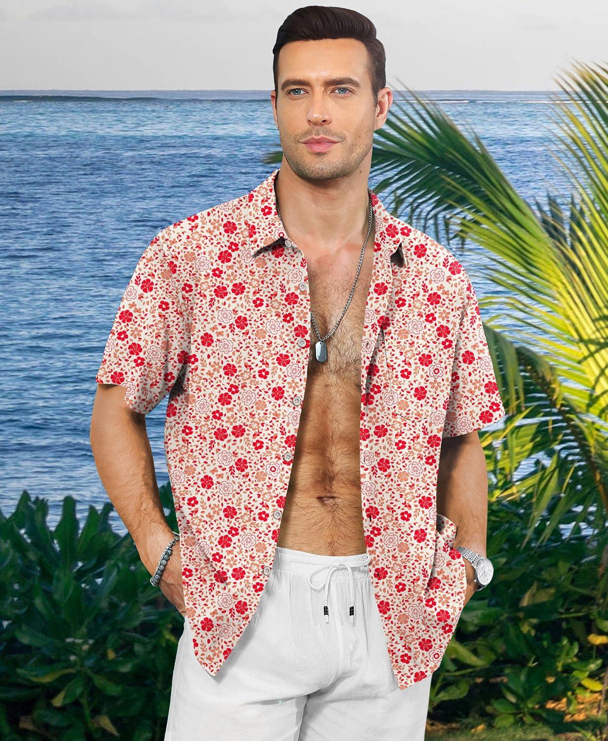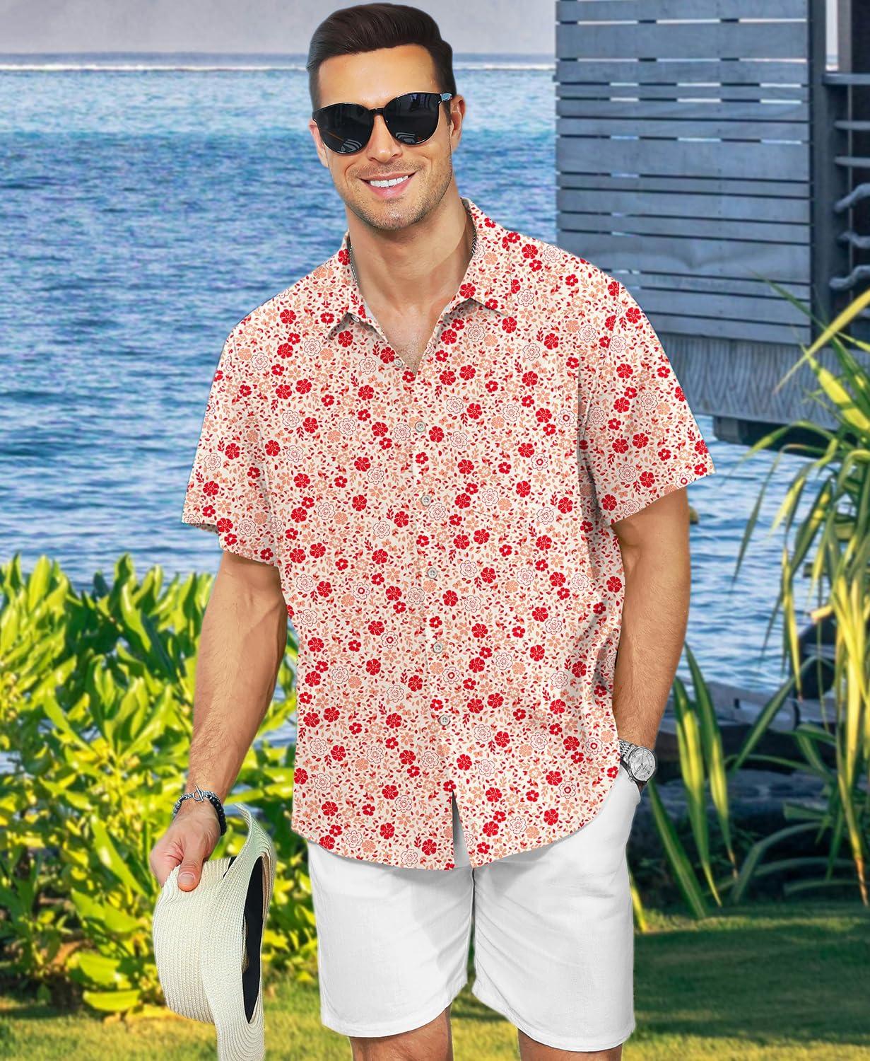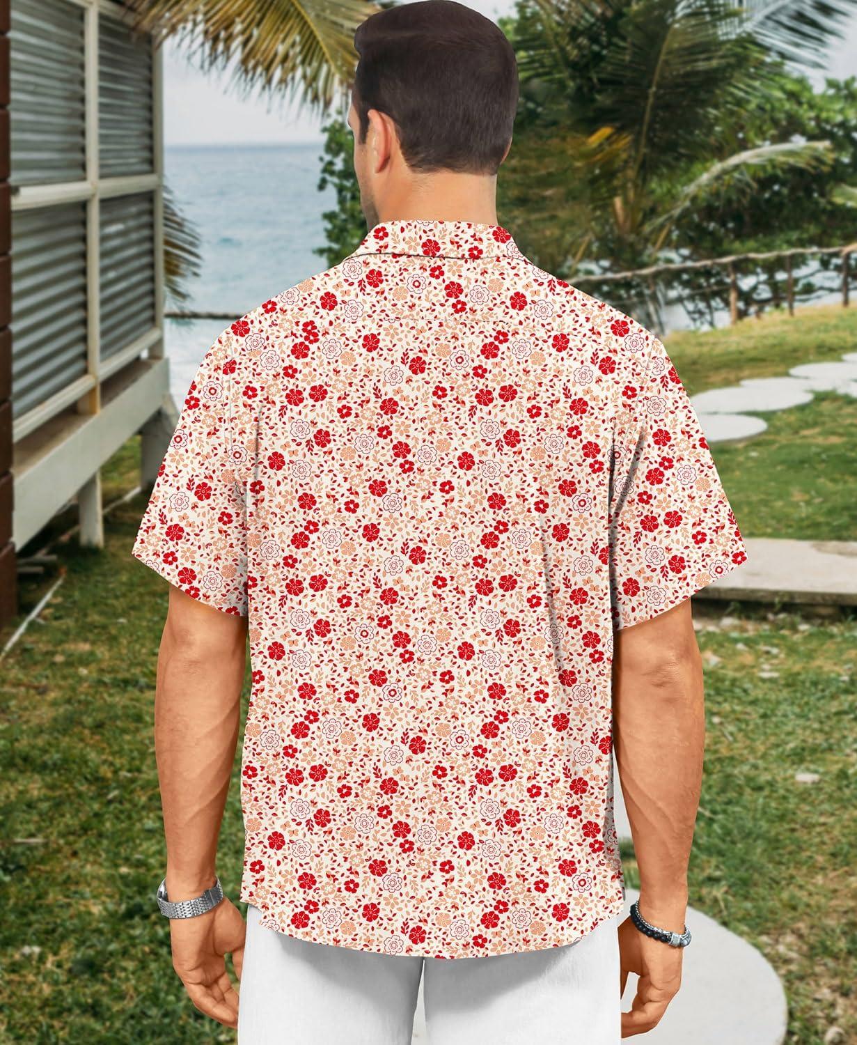 KYKU Men’s Hawaiian Shirt Short Sleeve – Tropical Summer Beach Button Down Shirt with Pocket(Light Beige Red Floral Mens Hawaiian Shirt)