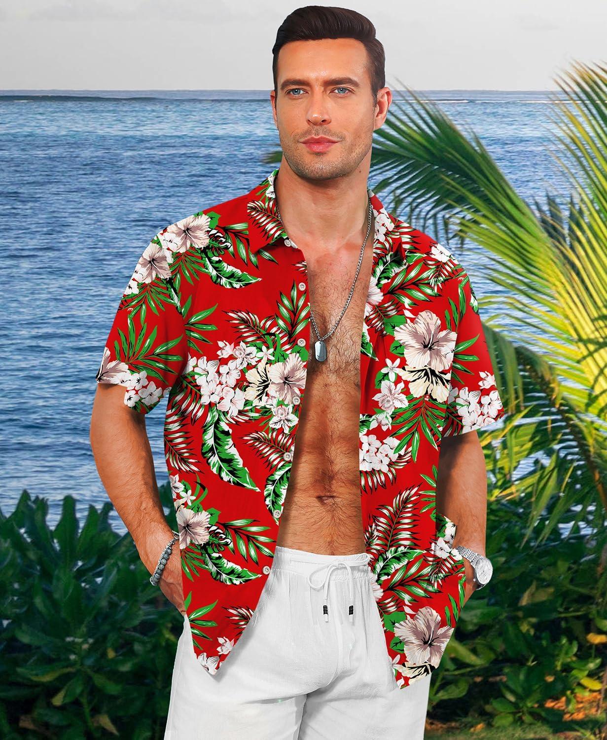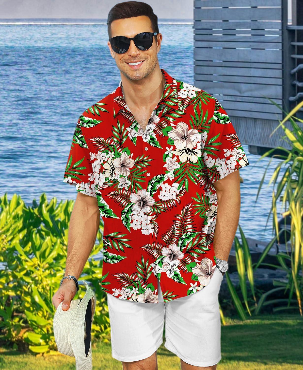 KYKU Men’s Hawaiian Shirt Short Sleeve – Tropical Summer Beach Button Down Shirt with Pocket(Red Flower Mens Hawaiian Shirt)