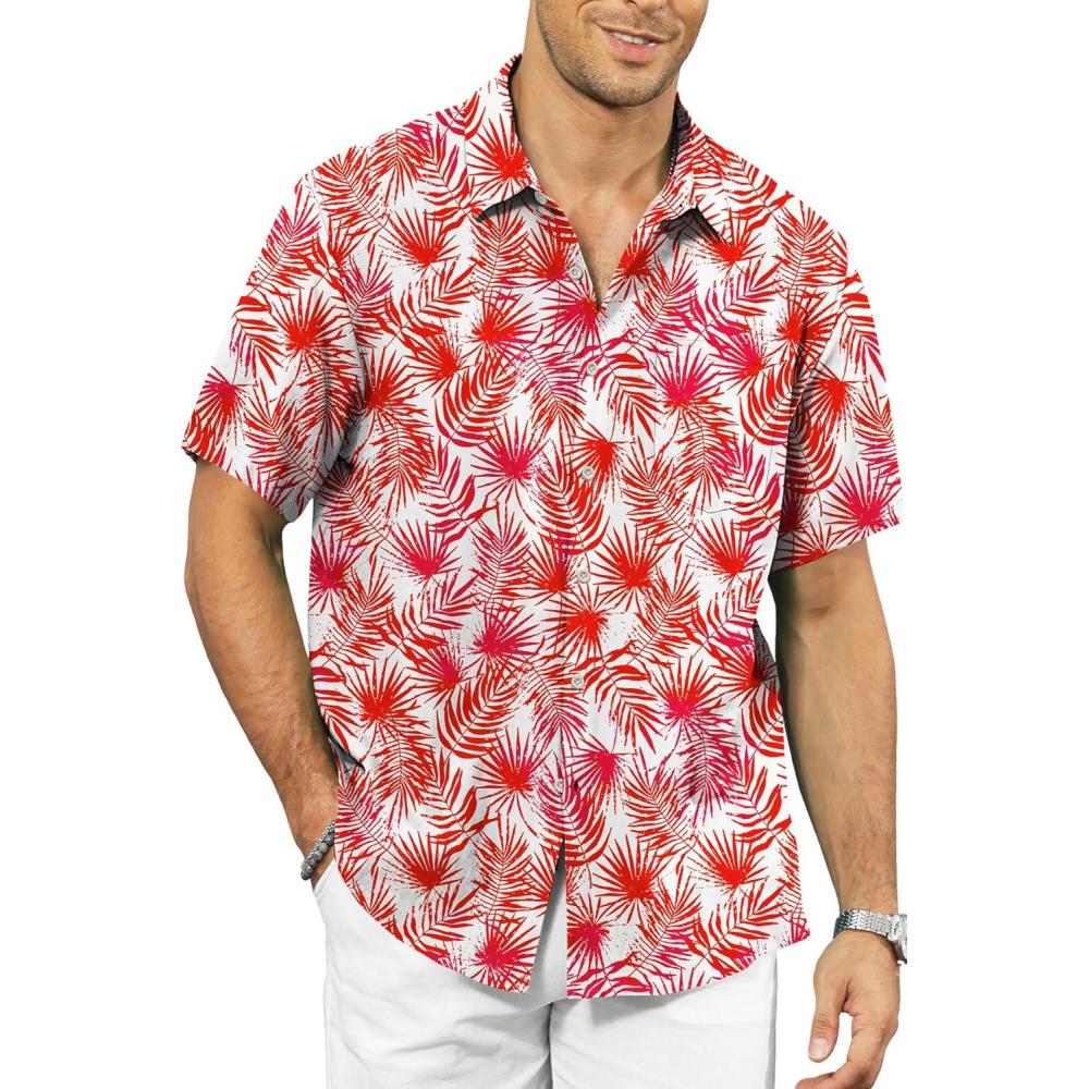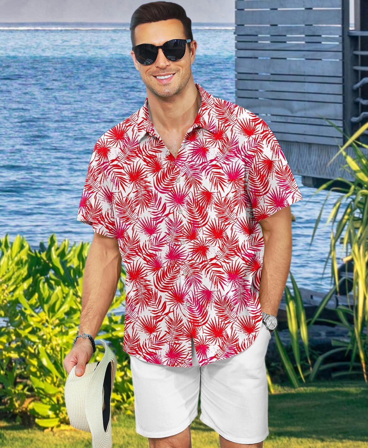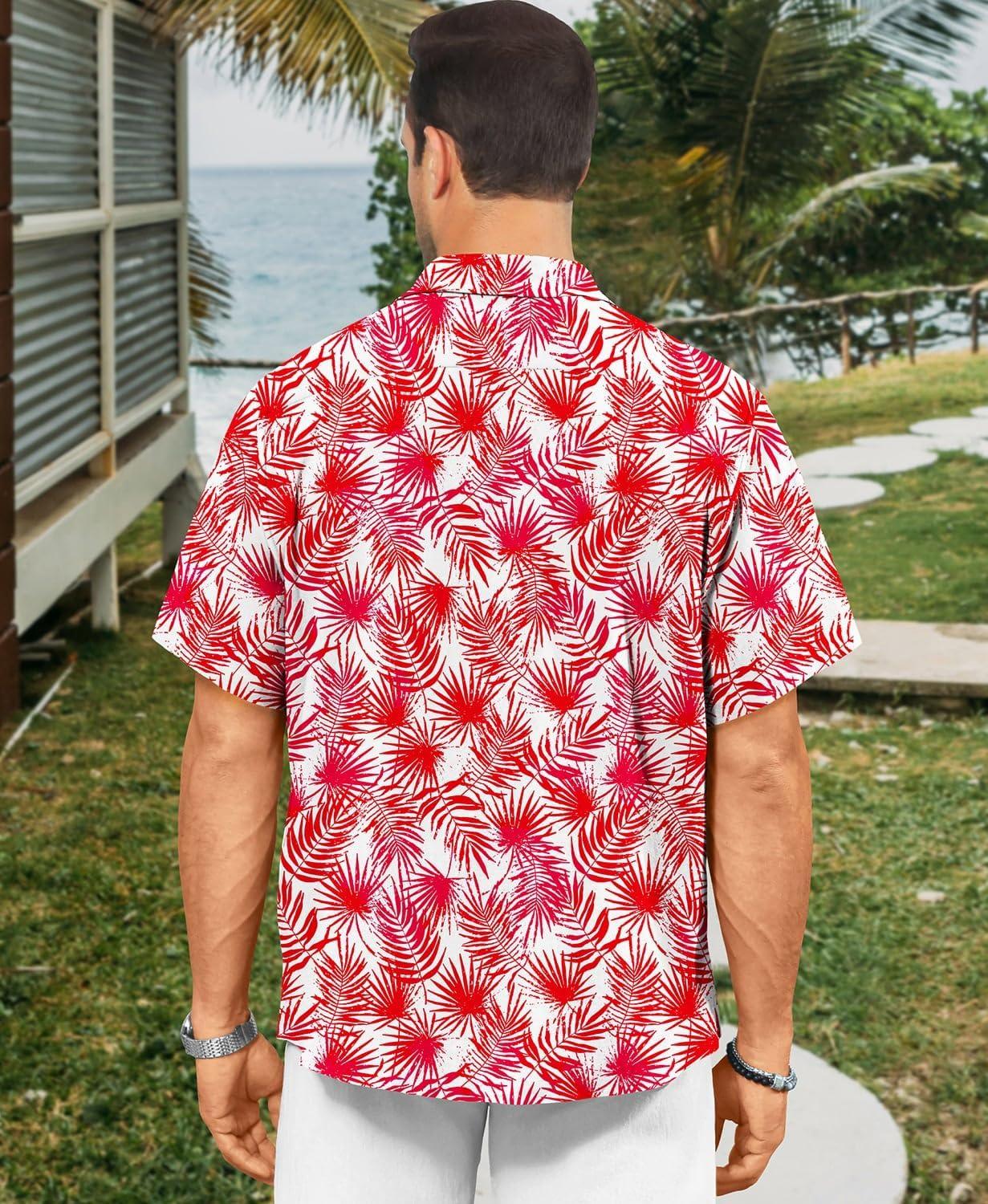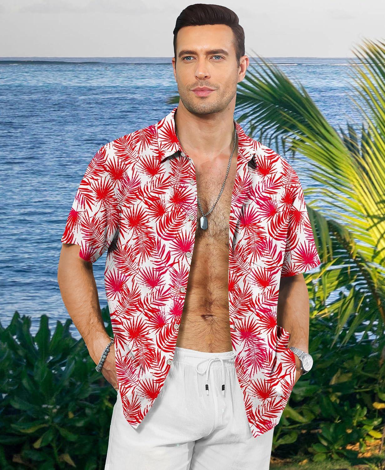 KYKU Men’s Hawaiian Shirt Short Sleeve – Tropical Summer Beach Button Down Shirt with Pocket(Red Tropical Leaf White Mens Hawaiian Shirt)