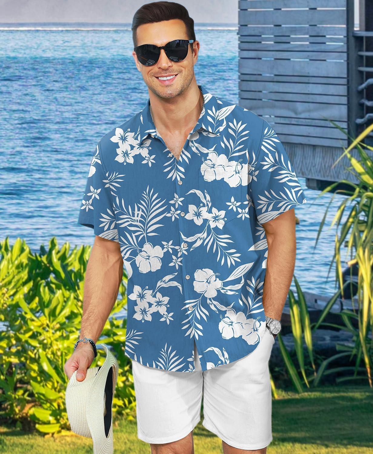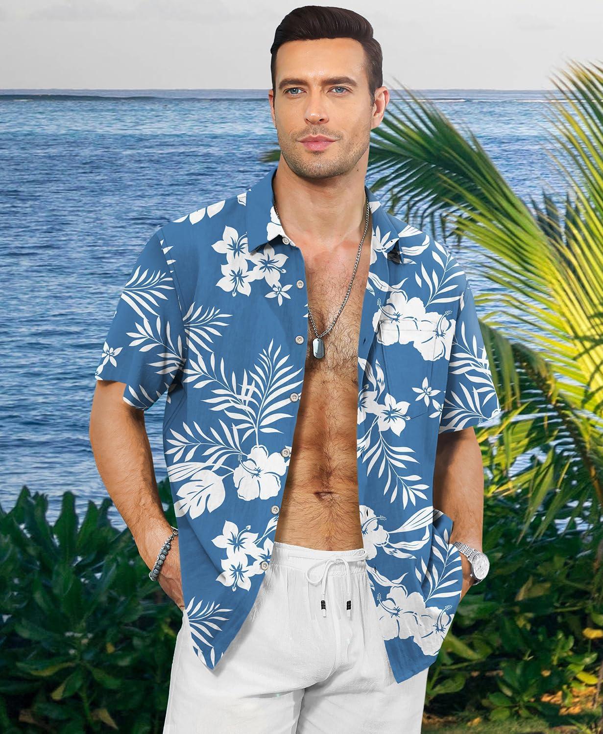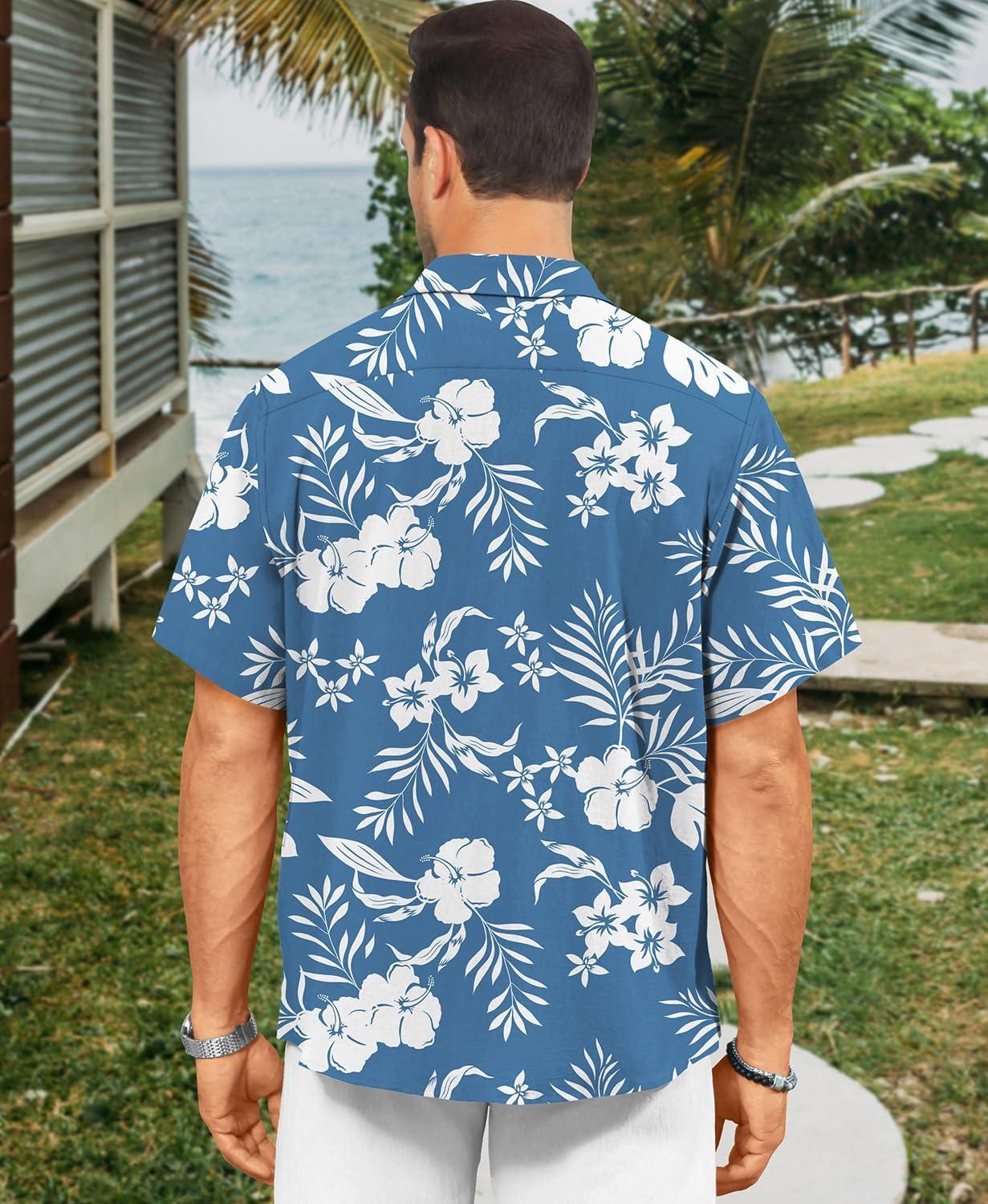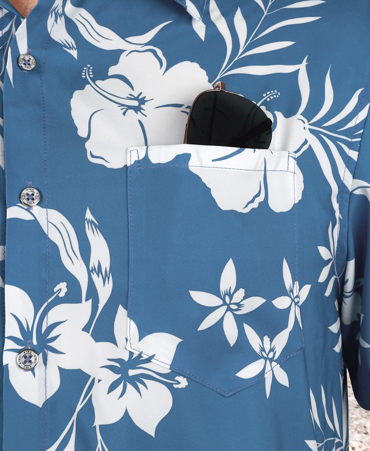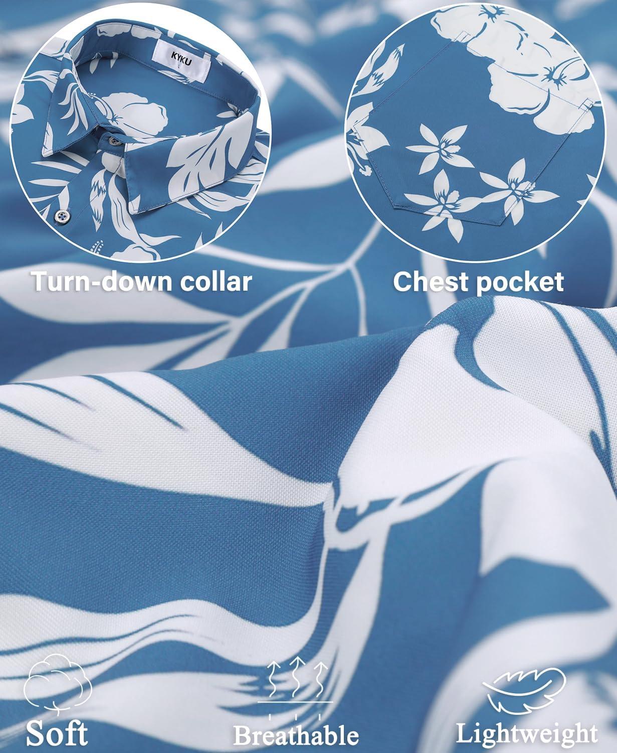 KYKU Men’s Hawaiian Shirt Short Sleeve – Tropical Summer Beach Button Down Shirt with Pocket(White Flower Blue Mens Hawaiian Shirt)