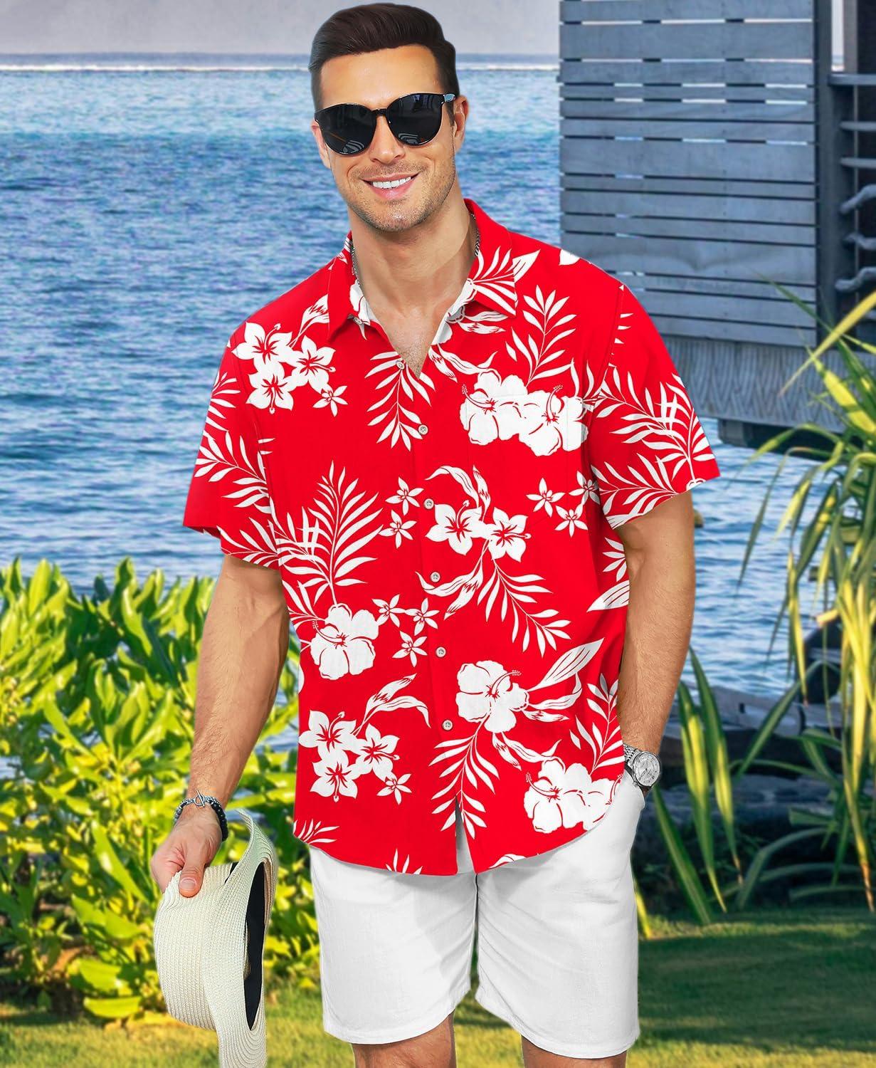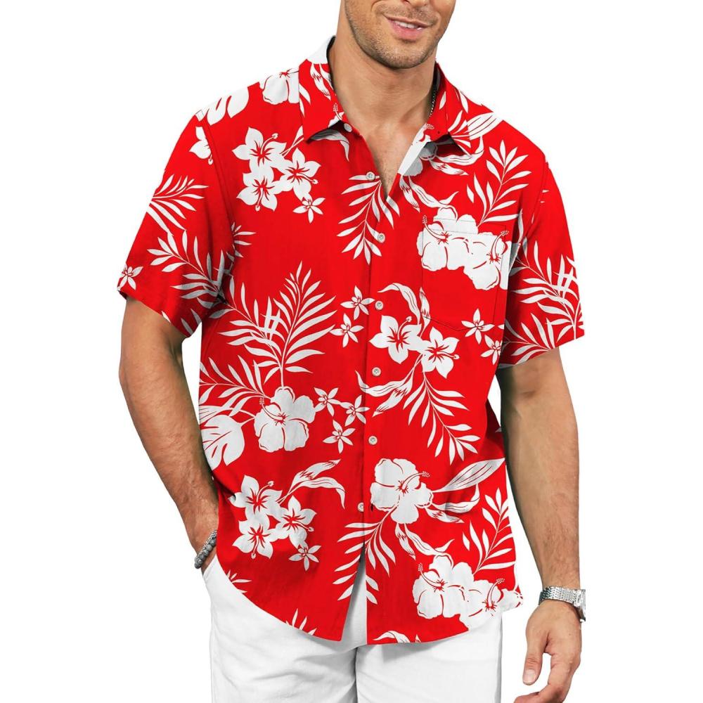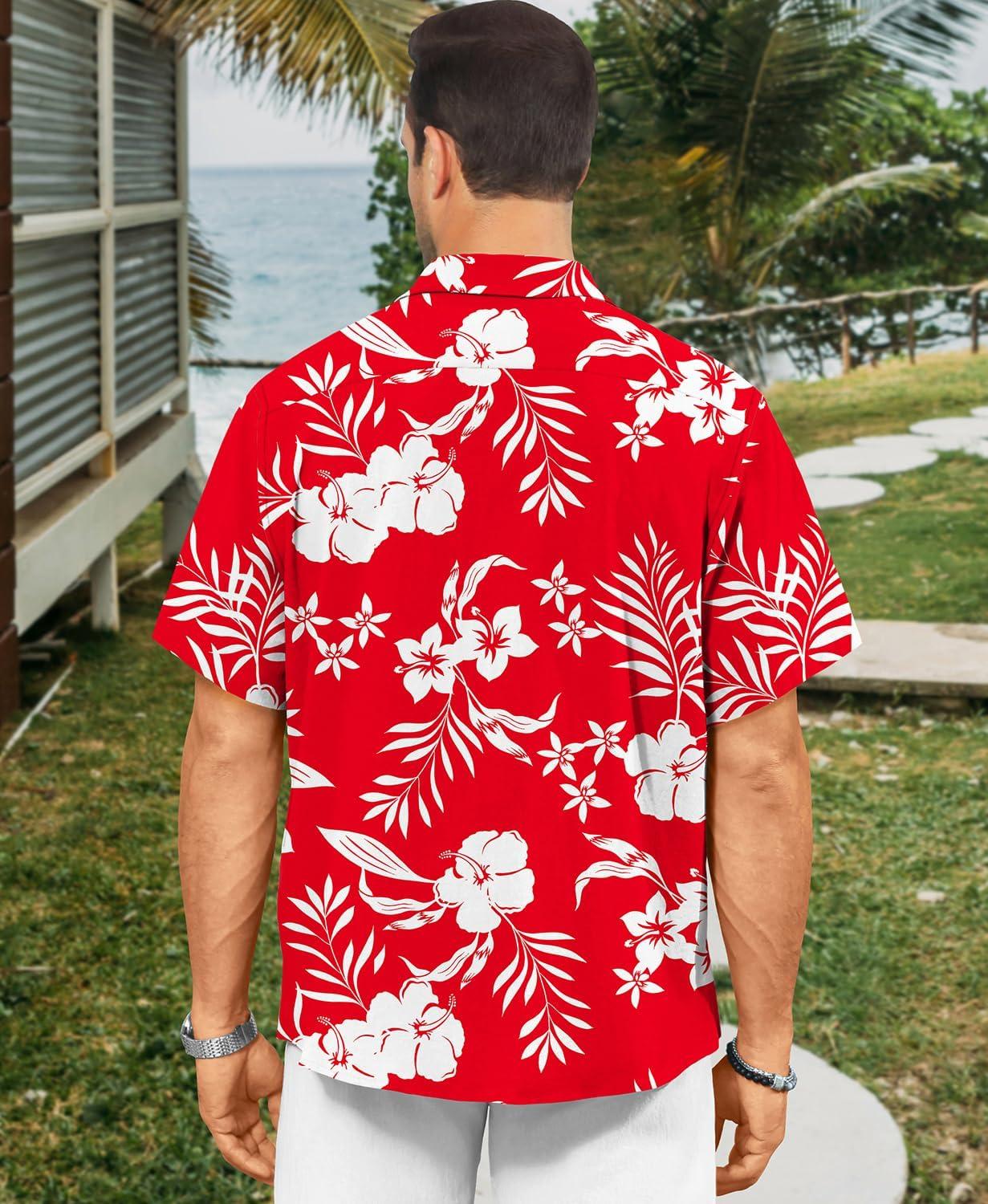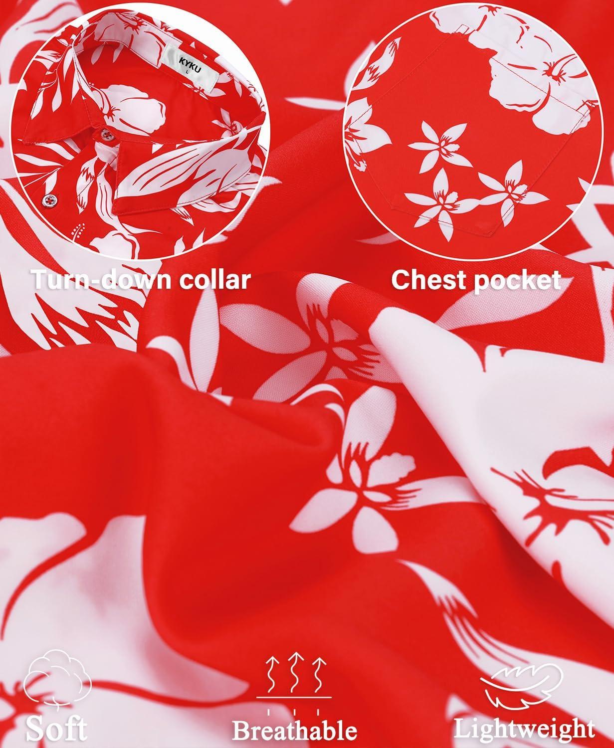 KYKU Men’s Hawaiian Shirt Short Sleeve – Tropical Summer Beach Button Down Shirt with Pocket(White Flower Red Mens Hawaiian Shirt)